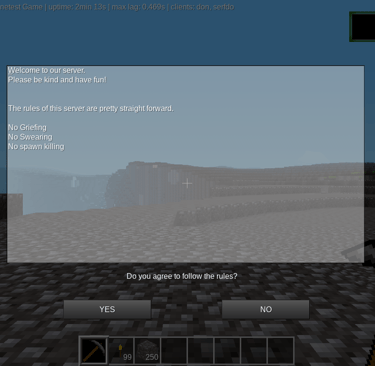 Adds admin tools Player Join Rules, curseword detection, chat commands and more to Luanti. It is meant for people who run a server. There's a few things that work for singleplayer but make sure you know what it does before you try it.